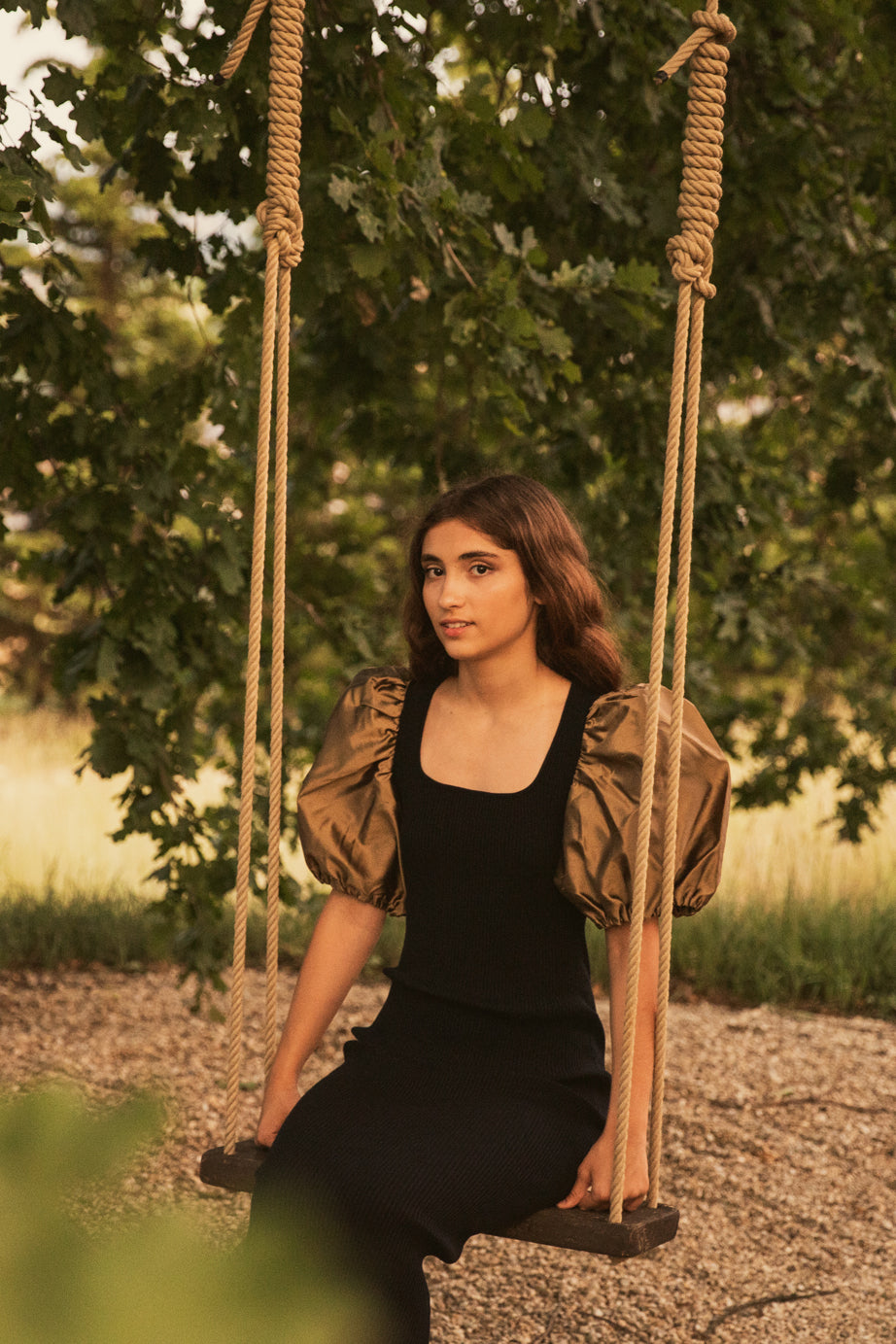 Ribbed dress in slightly stretchy viscose in midnight blu, with short puff sleeves in dark ochre shantung. Calf length. Artisan made in Italy.