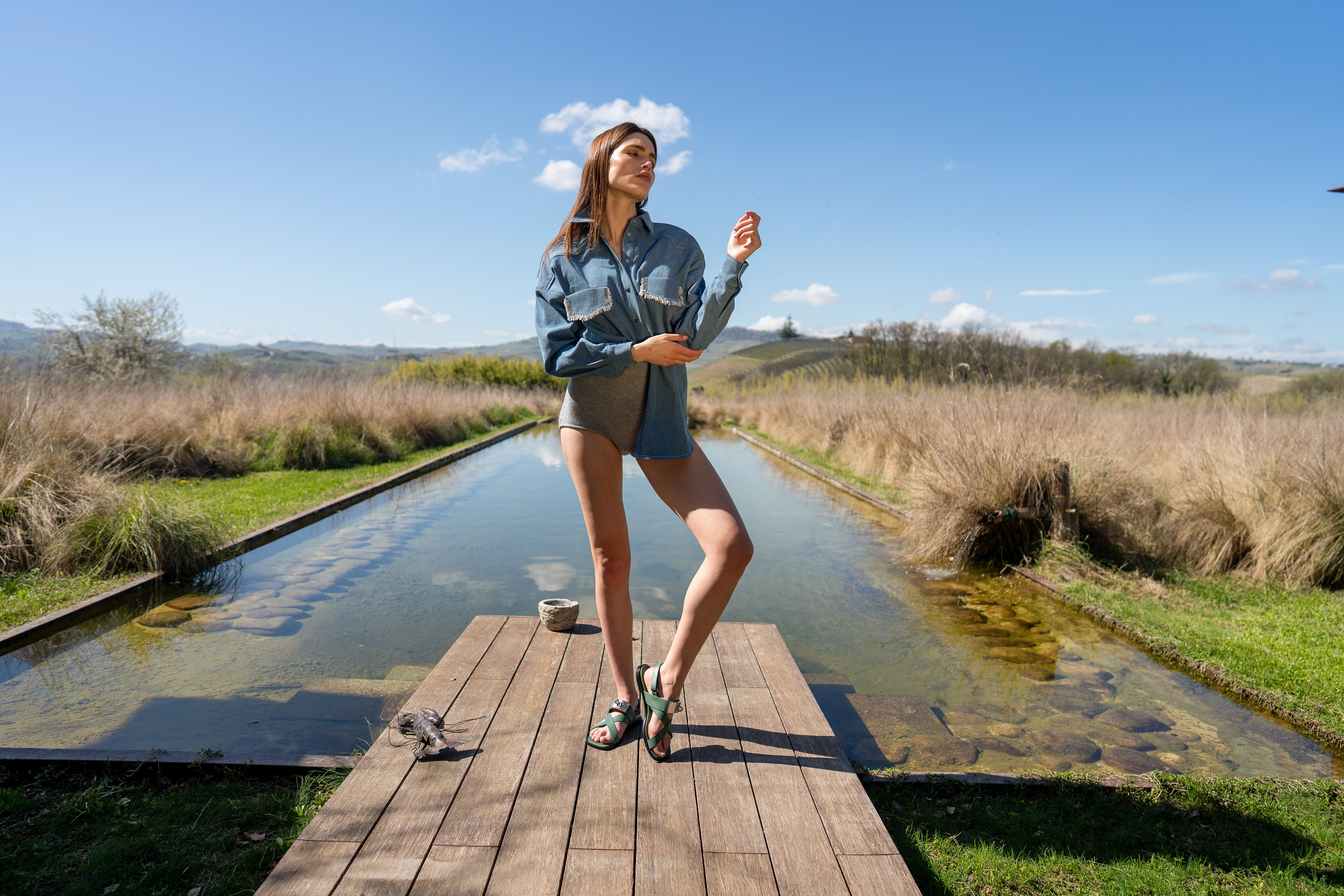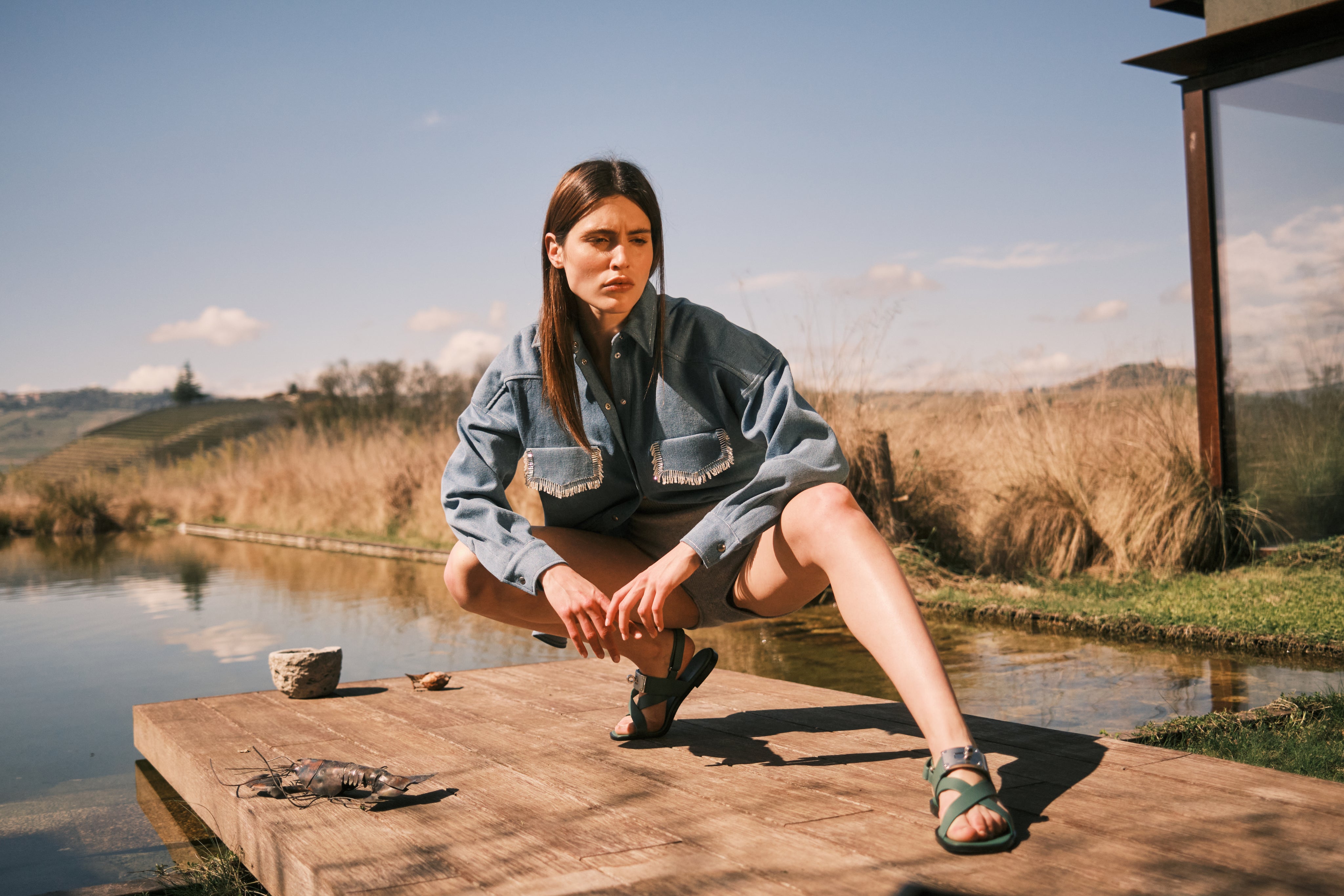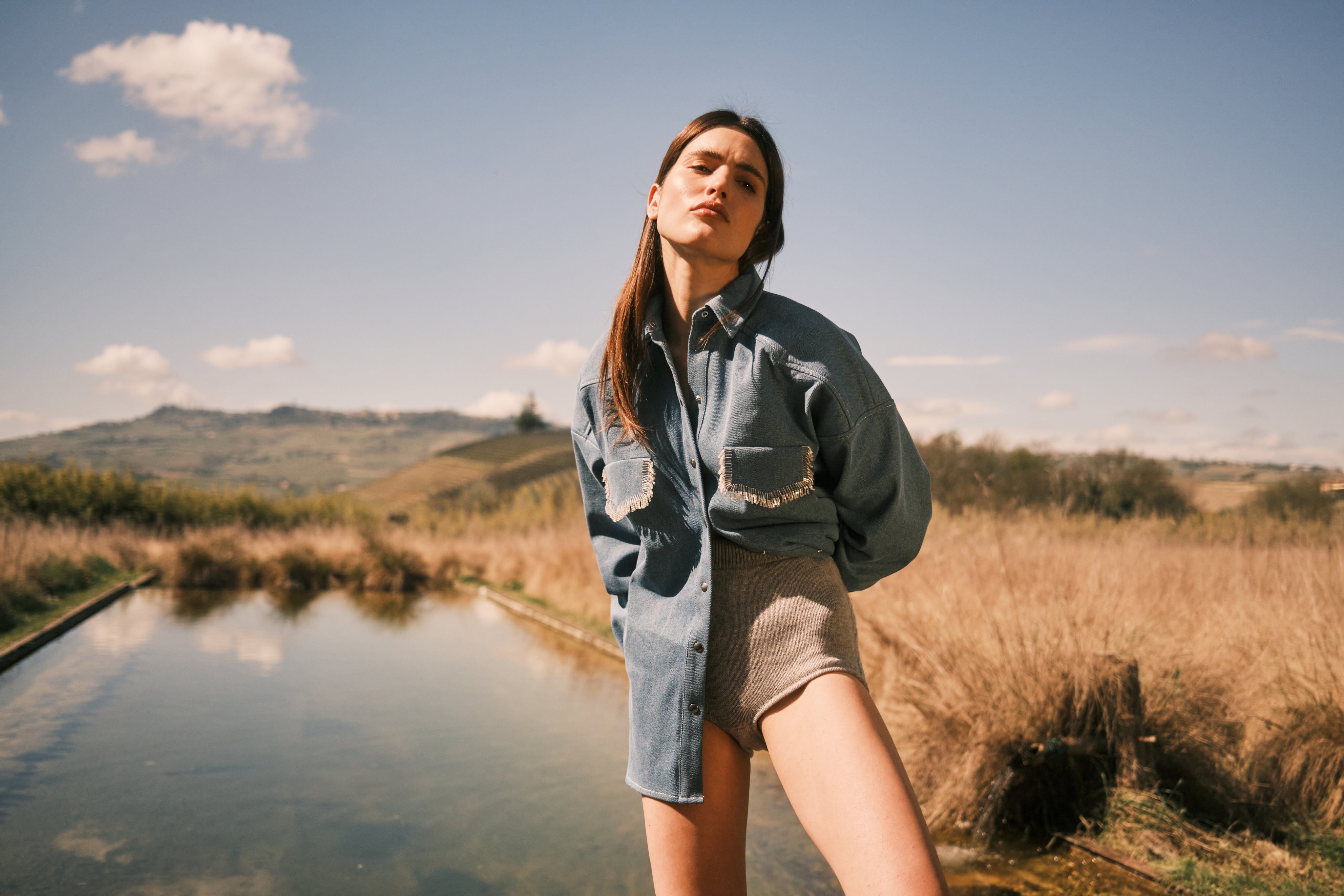 Shirt in pure organici cotton denim, featuring hand-embroidered silver fringes on the two front pockets, snap-button closure, long sleeves, cuffs and collar. Artisan-made in Italy.