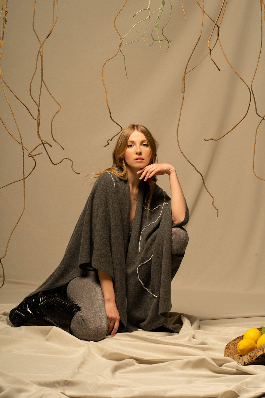 The My Roots is one-size piece in pure cashmere yarn, available made to order in 15 different colour combinations. The metallic embroidery unfolds across the font of the cape: Its hand execution requires 2 hours to complete. Please get in touch if you wan to order your own customised cape.