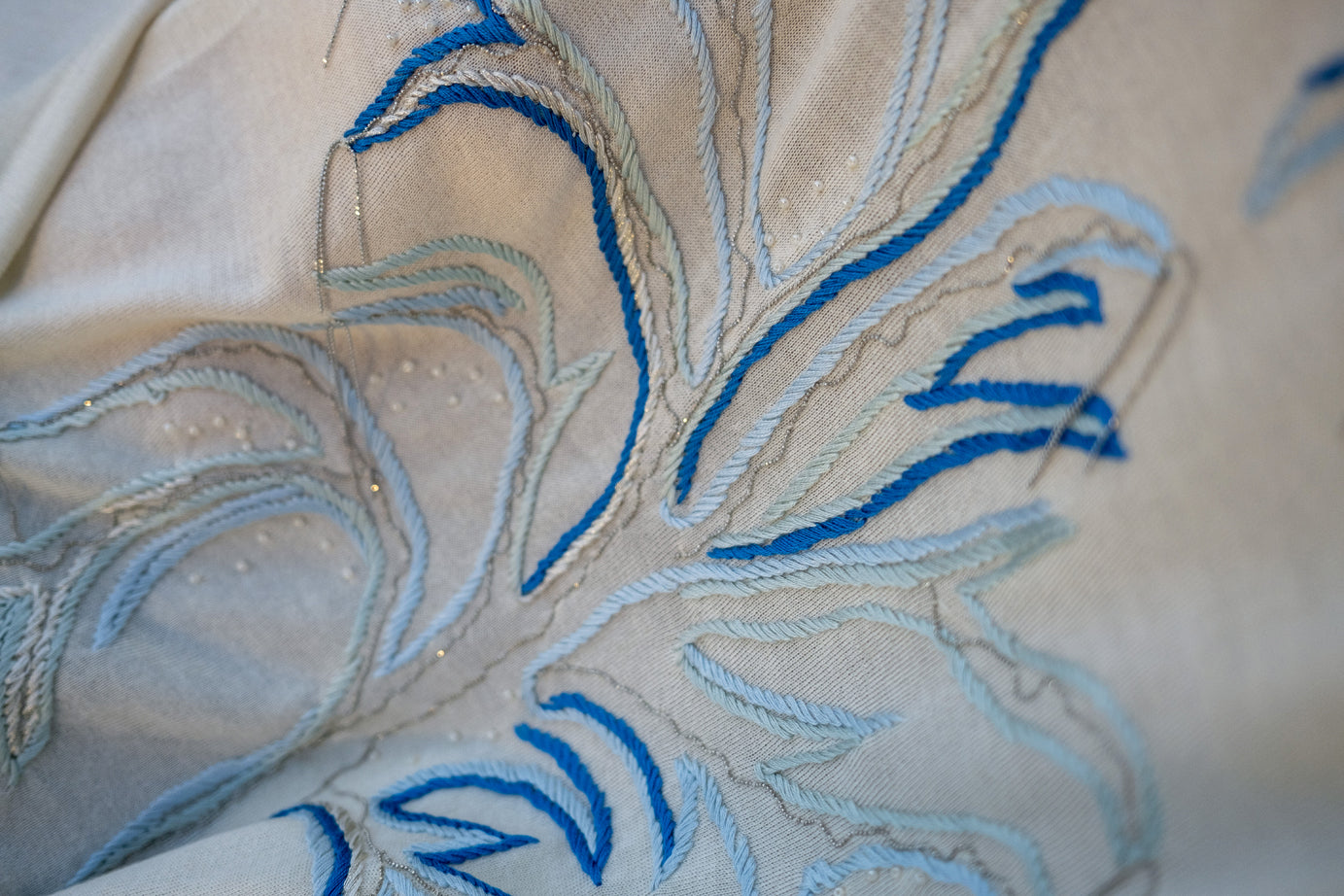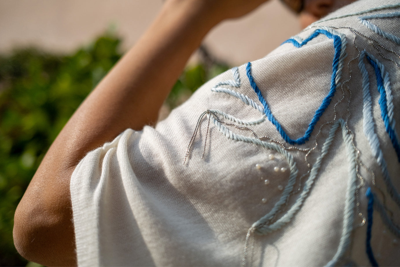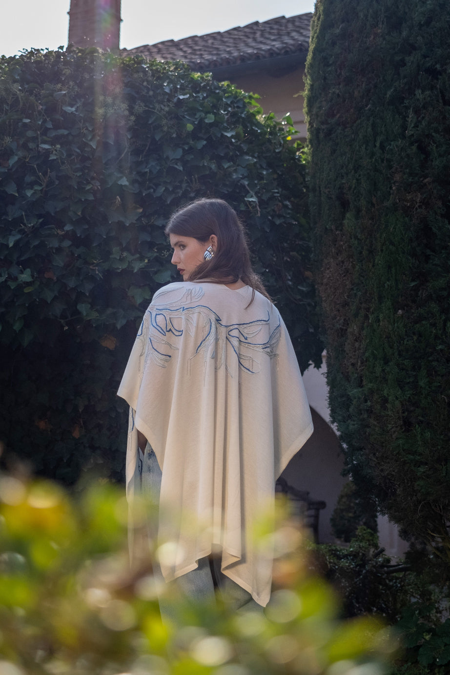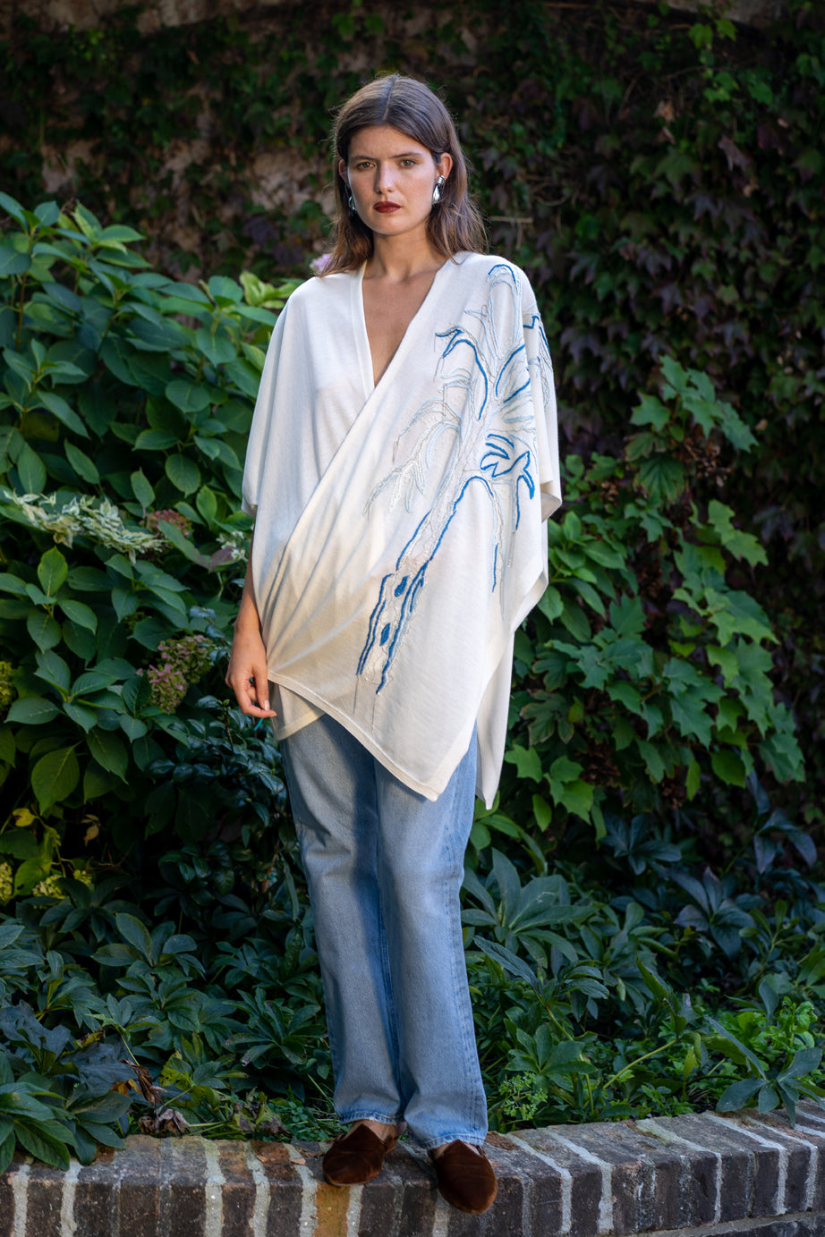 The My Tree cape is one-size piece in pure cashmere and silk yarn, available in a white colour. The multicoloured embroidery, which includes beads and metallic threads, unfolds across the entire back and continues along the left edge of the cape: it depicts, in stylized form, an imaginary tree of life, a favoured theme in Stefania Esse' symbolic language; Its hand execution requires 15 hours to complete.
