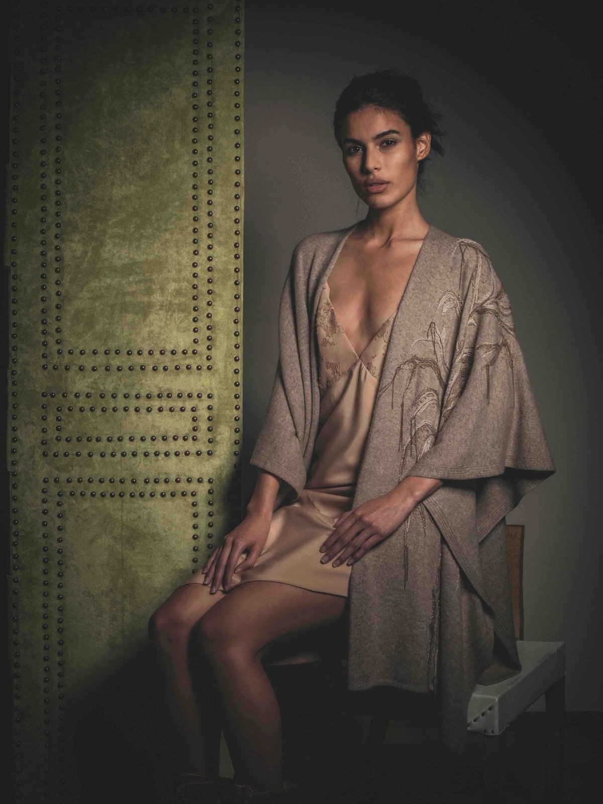 The My Tree cape is one-size piece in pure cashmere yarn, available made to order in 15 different colour combinations. The multicoloured embroidery, which includes beads and metallic threads, unfolds across the entire back and continues along the left edge of the cape: it depicts, in stylized form, an imaginary tree of life, a favoured theme in Stefania Esse' symbolic language; Its hand execution requires 15 hours to complete. Please get in touch if you want to create your own custom made cape.