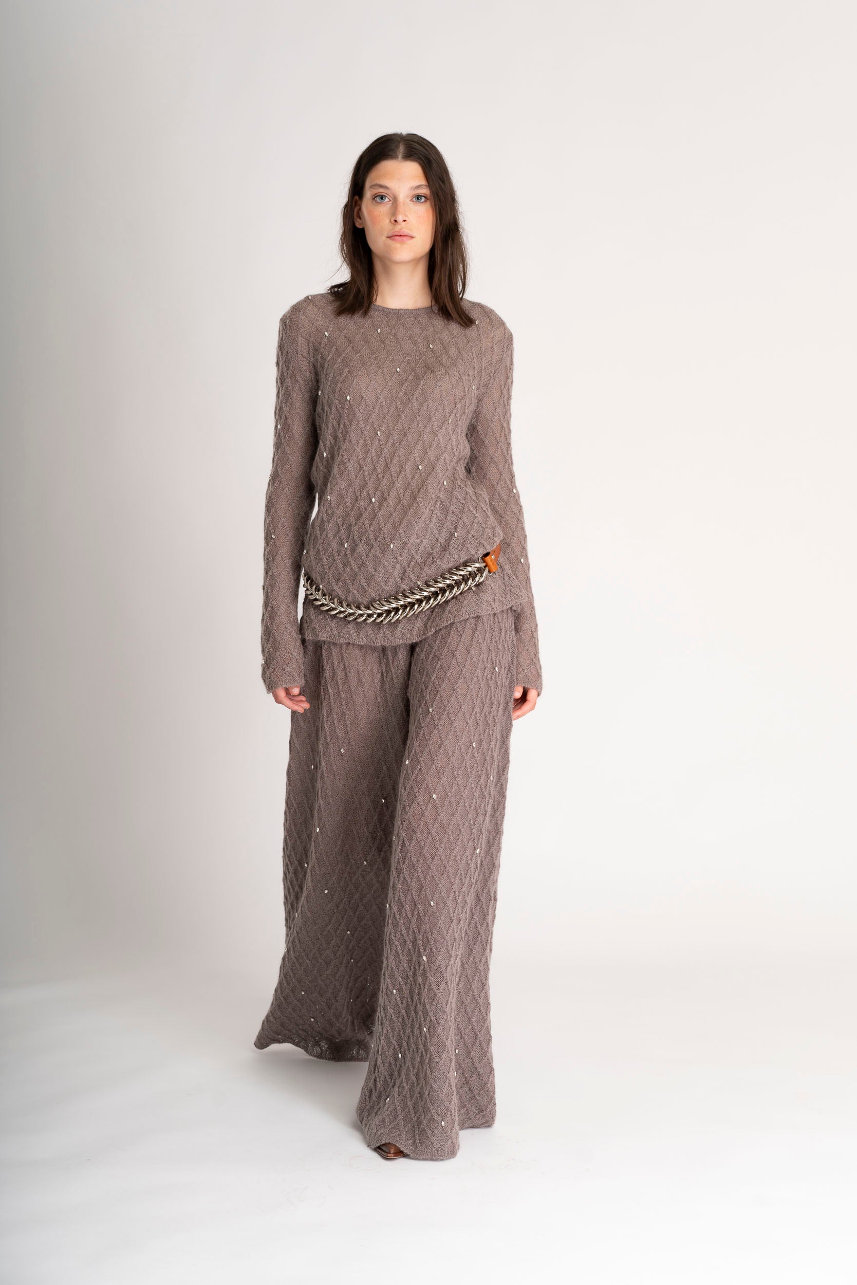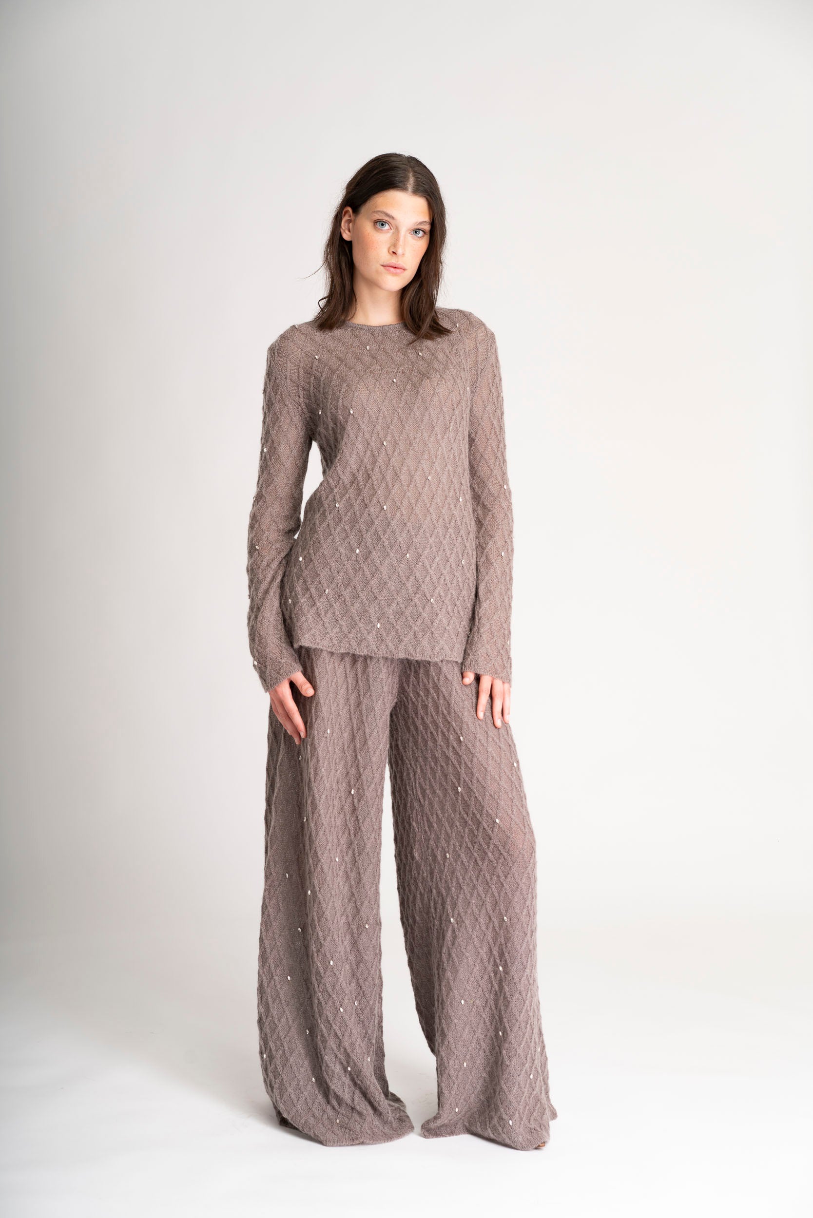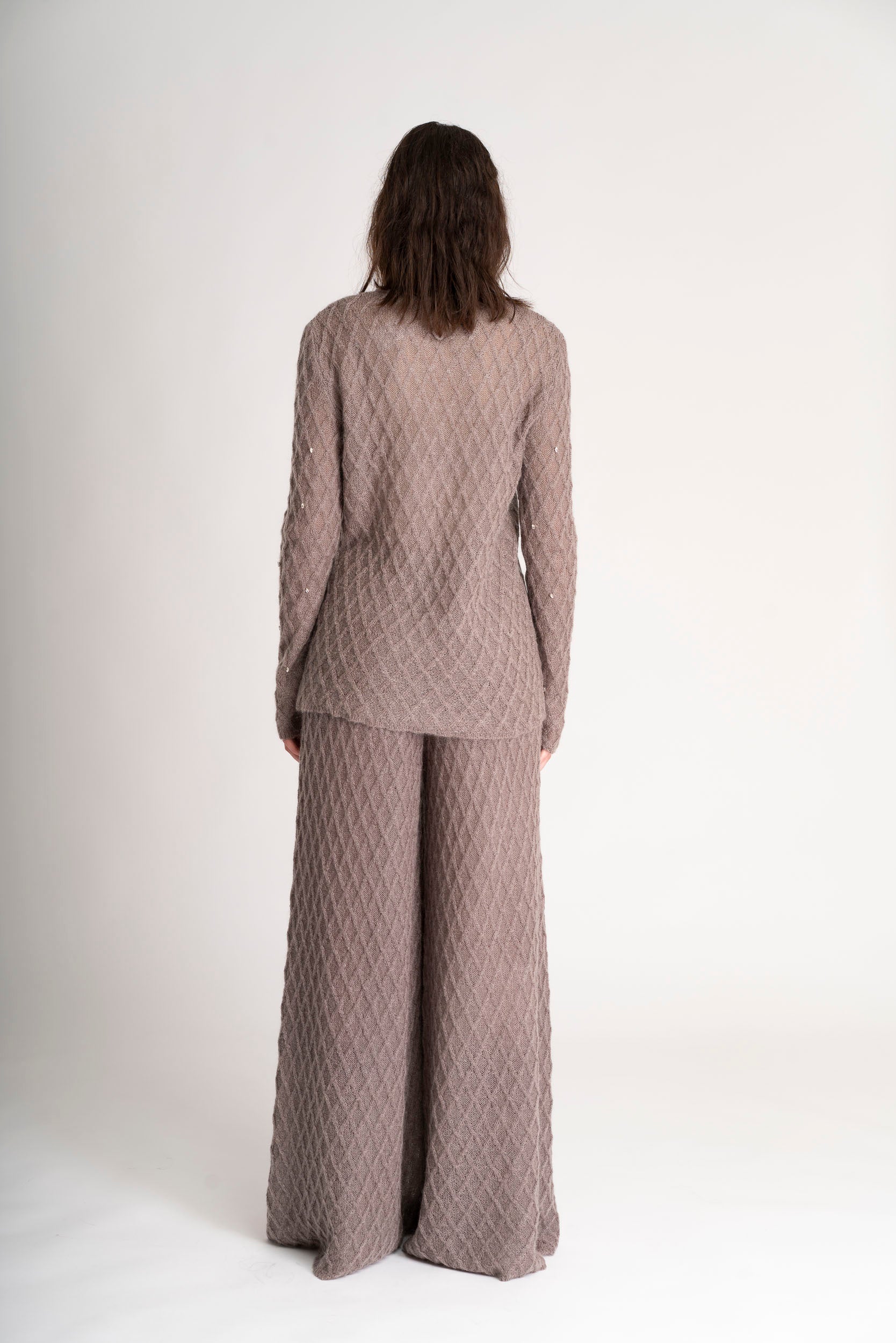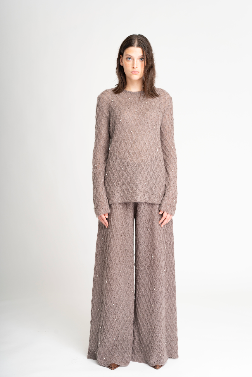 The Diamond in the rough set is a mohair set featuring a sleek top and wide trousers, adorned with delicate micro-crystal embroidery.
