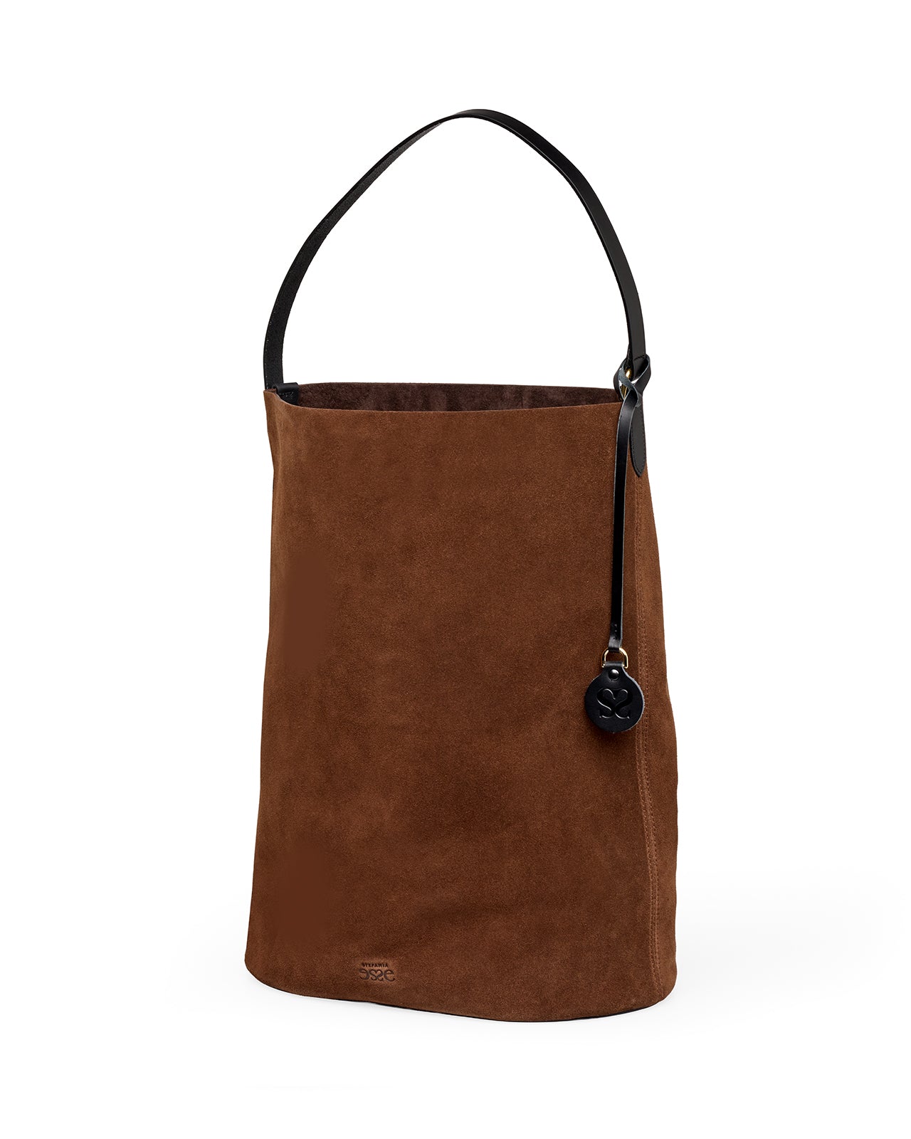 Essenza is a sculptural bucket bag crafted from chocolate brown nubuck, offering a soft texture and refined, natural elegance. The interior features black suede lining, creating a subtle contrast and luxurious finish. The design is completed with bronze hardware and internal black leather pocket with straps, providing secure storage for essential items while maintaining the bag minimalist aesthetic.