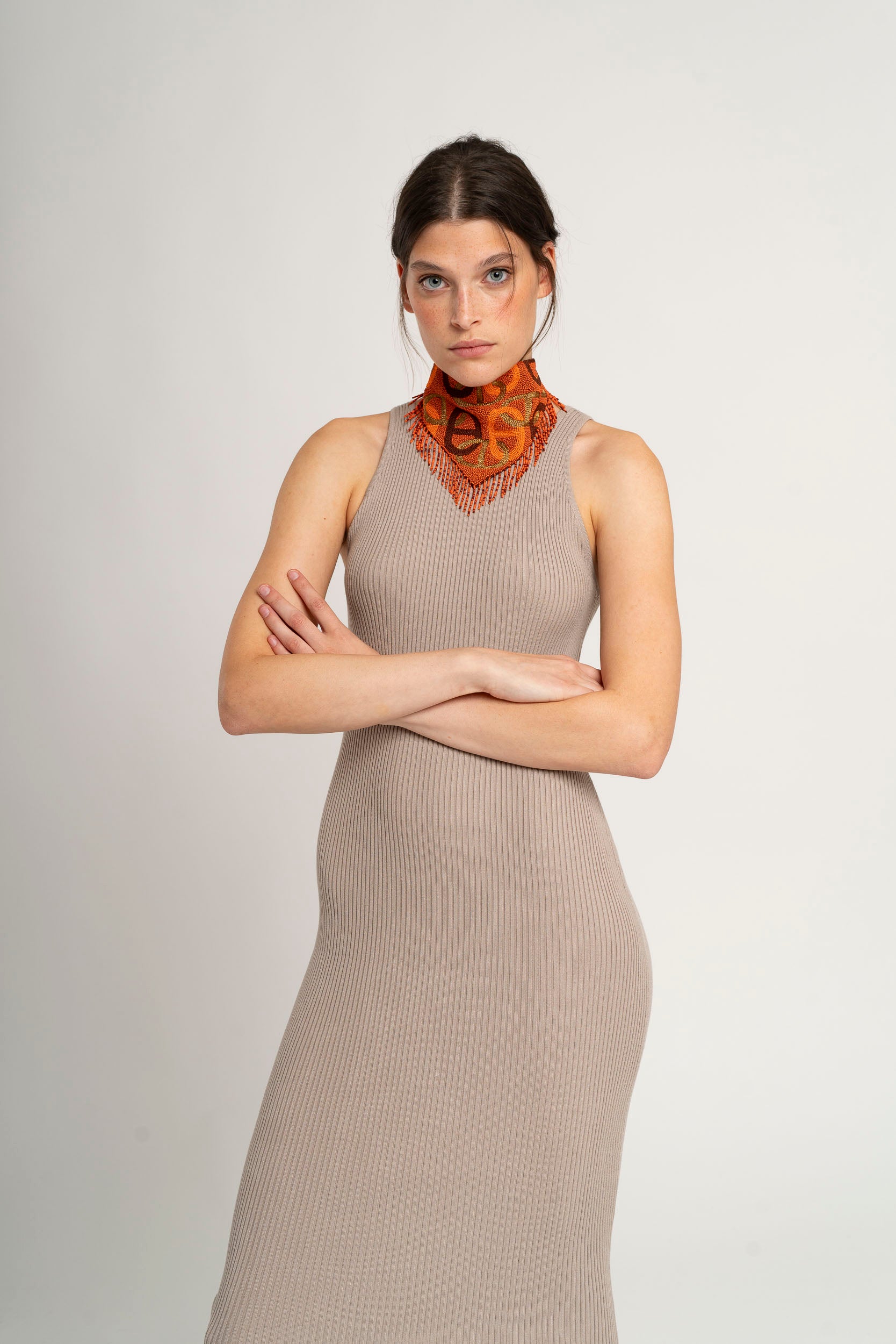 A refined embroidered silk bandana featuring bold geometric motifs, blending Hermes inspired elegance with a western spirit. Orange background with brown and gold motifs